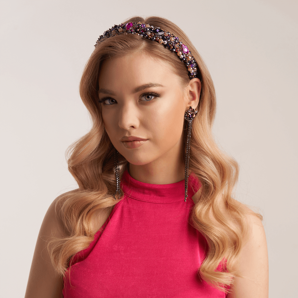 Kolczyki Amore zostały wykonanie ręcznie z kryształków i kamieni w sensualnej kolorystyce purpury i srebra. Uzupełnieniem są delikatne, długie łańcuszki z cyrkoniami i srebrnymi kulkami.