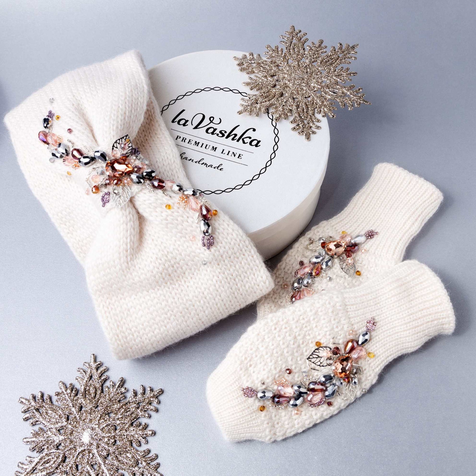 Rękawiczki oraz opaska są wykonane z miłej i ciepłej dzianiny. Ozdoby zostały wykonane z ręcznie naszywanych kryształków i koralików. Rękawiczki posiadają osobny otwór na kciuk i dopasowują się do dłoni dzięki ściągaczom.