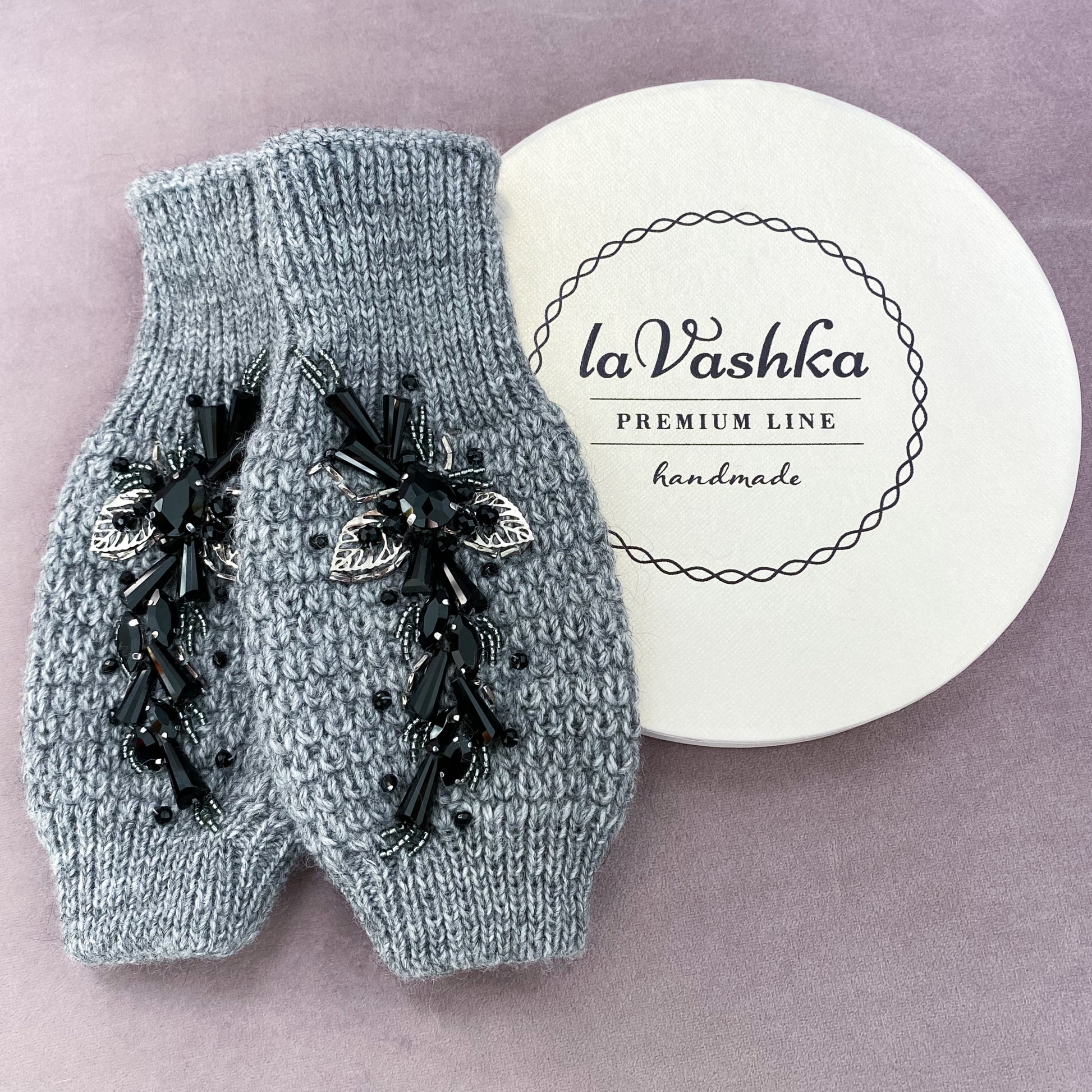 Rękawiczki oraz opaska są wykonane z miłej i ciepłej dzianiny. Ozdoby zostały wykonane z ręcznie naszywanych kryształków i koralików.